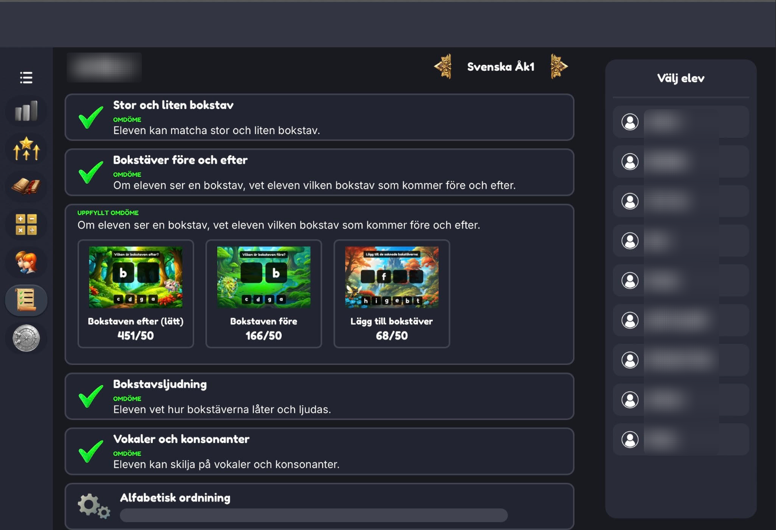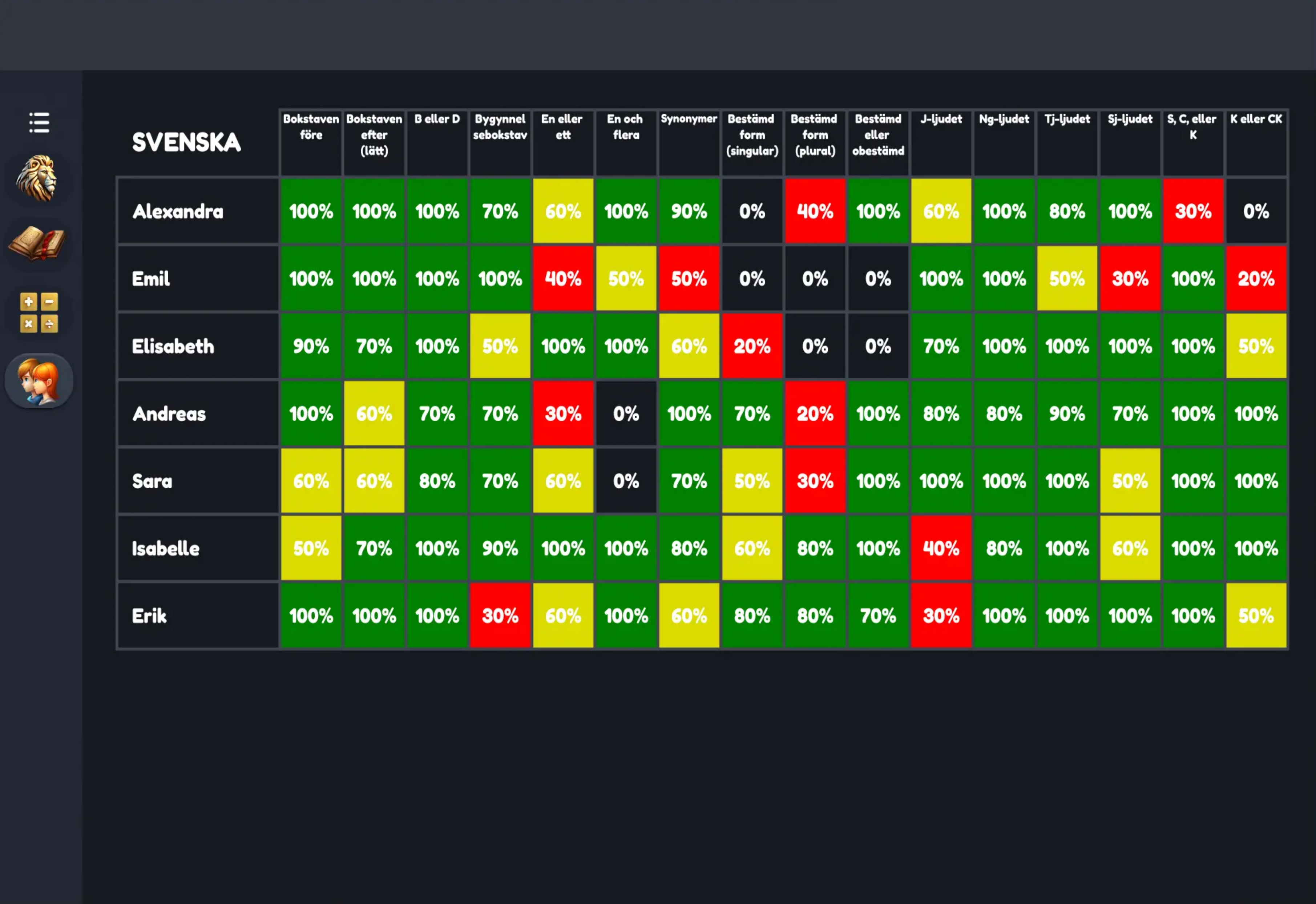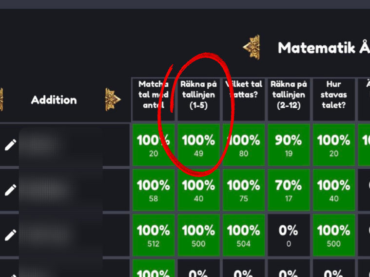 Matrisen är inte bara en översikt – den ger också detaljerad insyn i ditt barns kunskaper. Du kan se övning för övning vad barnet bemästrat och exakt var det behövs mer träning.